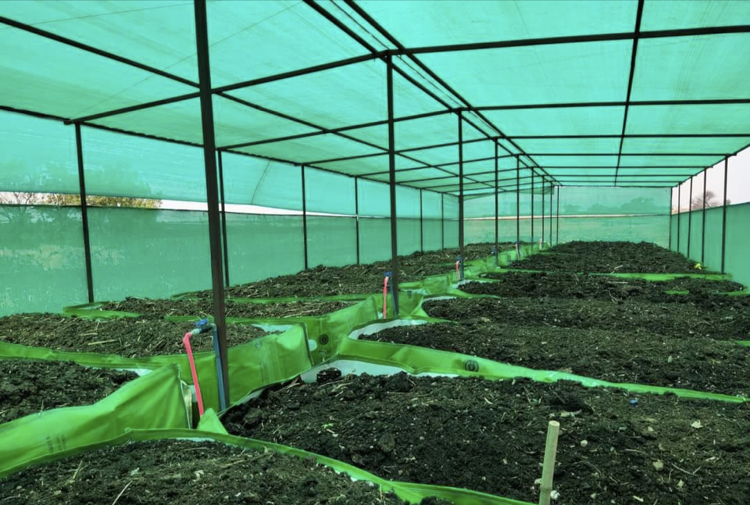 ची लांबी 12 फुट रुंदी 4 फुट व उंची 2 फुट (12x42) अशी असते. त्याच्या/बेडच्या बाजूला नेहमी हवा खेळती राहण्याकरिता व ओलावा टिकून राहण्या करिता NET WINDOW ची व्यवस्था केली आहे. त्याच्या सर्व बाजू उंच व गुळगुळीत असल्यामुळे त्यावर साप, उंदीर, मुंगी येऊ शकत नाही. परिणामी गांडूळांना कळल्याही धोका संभवत नाही. असा हा HDPE Vermi Bed आपण अत्यंत कमी जागेत कमी वेळात सहज उभारू शकतो. तसेच तो Mooveable असल्यामुळे